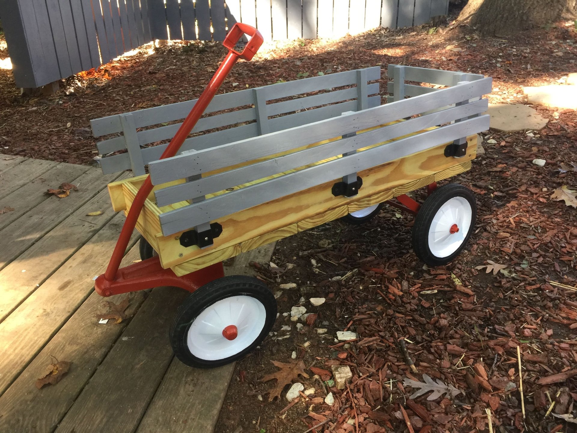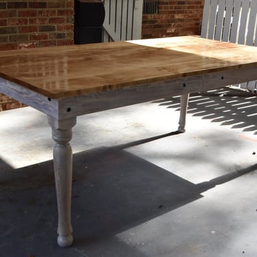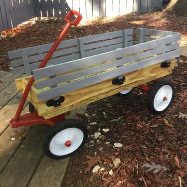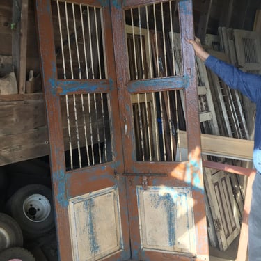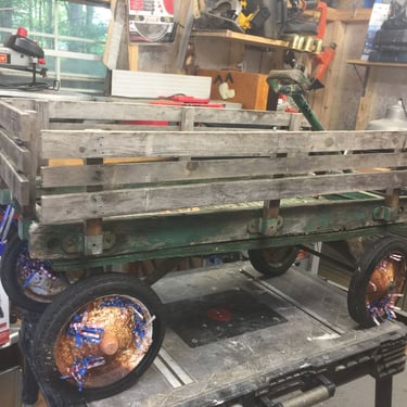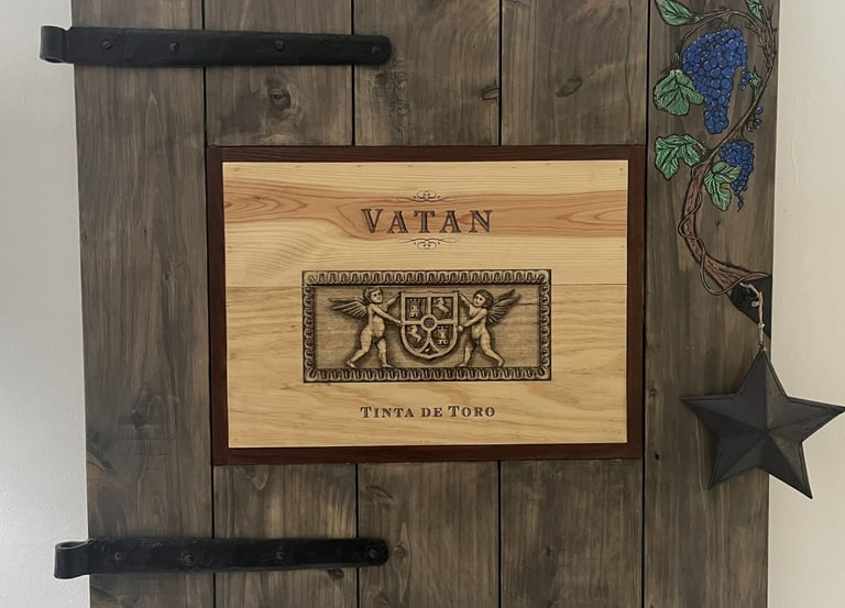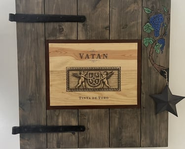 Rough sawn white pine with imbedded wine case top. Reclaimed door straps and hand painted grape vines.